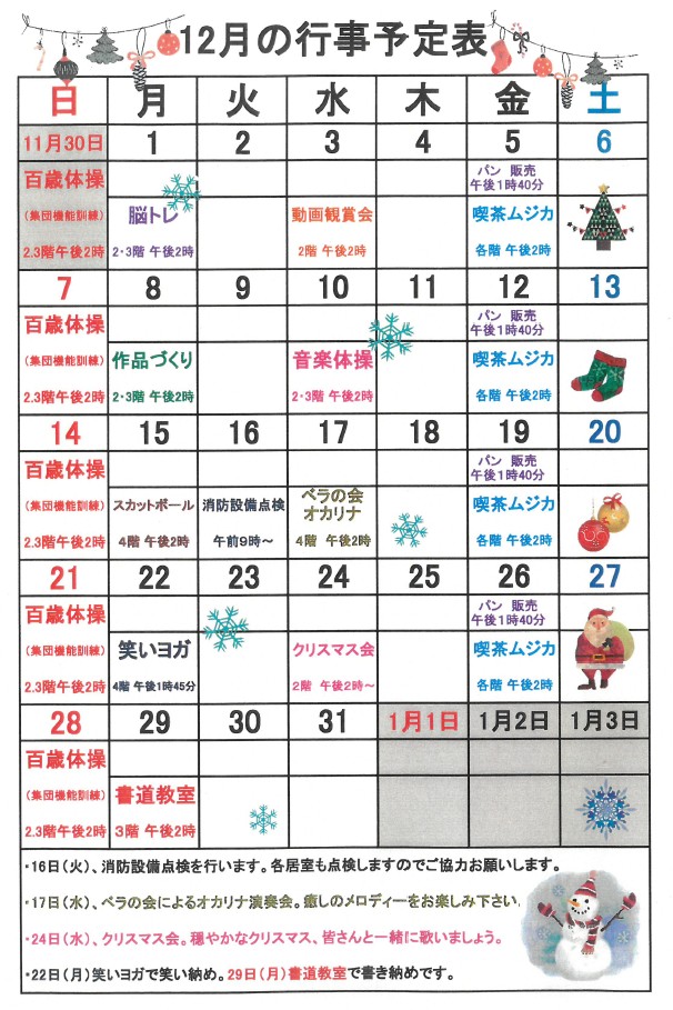 季節を感じていただくものや、個々に応じた趣味活動、演芸観賞、外出行事などを行っています。